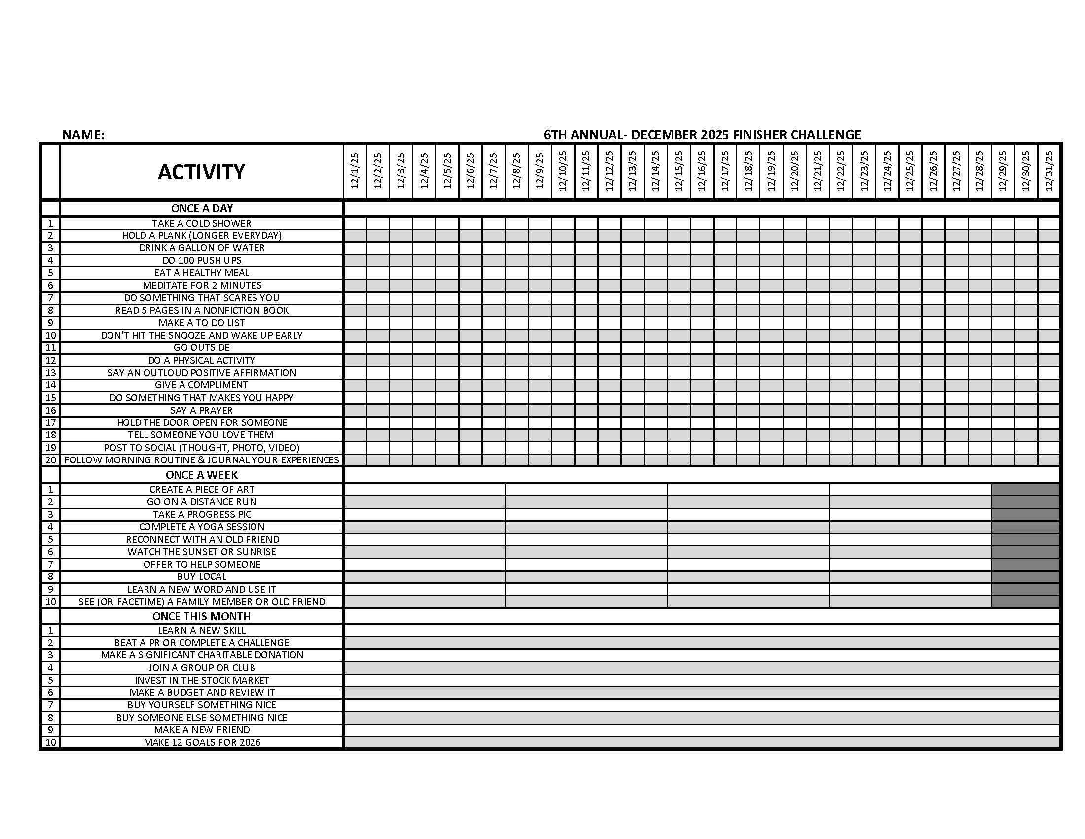 This is meant to be a personal journey and challenge to get better each day. Many people will edit this list to fit their goals and needs, my only recommendation is to make it a challenge! (see downloadable worksheets below)